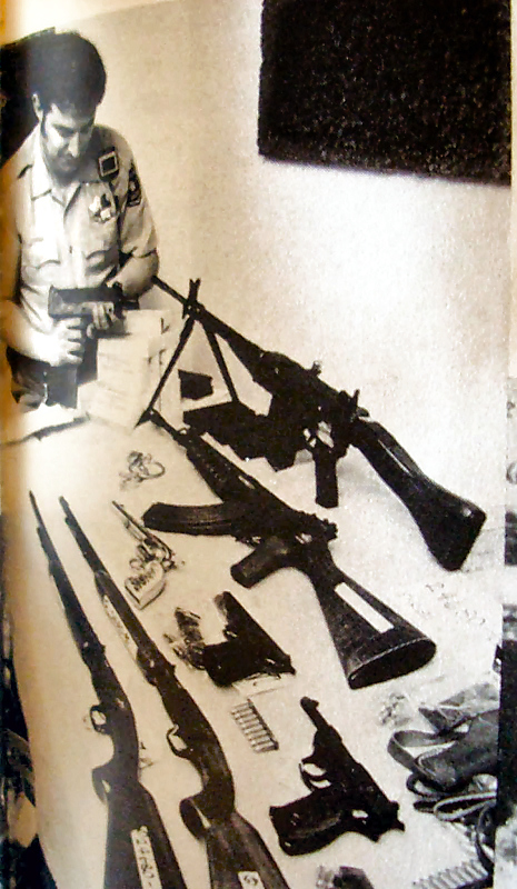 Photo left: Berkeley police officer Joe Sanchez Inspects the weapons police discovered in 1980, when they searched an unregistered Mercedes parked at the home of Hansadutta, then the Berkeley temple's guru.